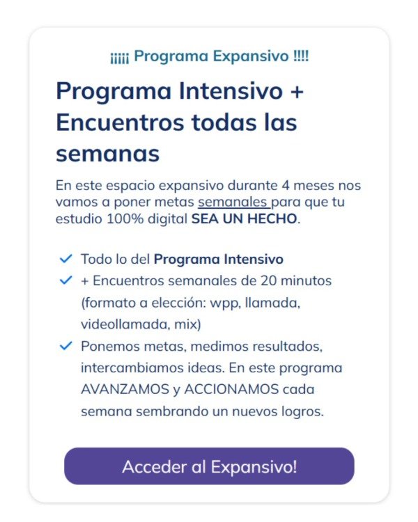 En este espacio expansivo durante 4 meses nos vamos a poner metas semanales para que tu estudio 100% digital SEA UN HECHO.